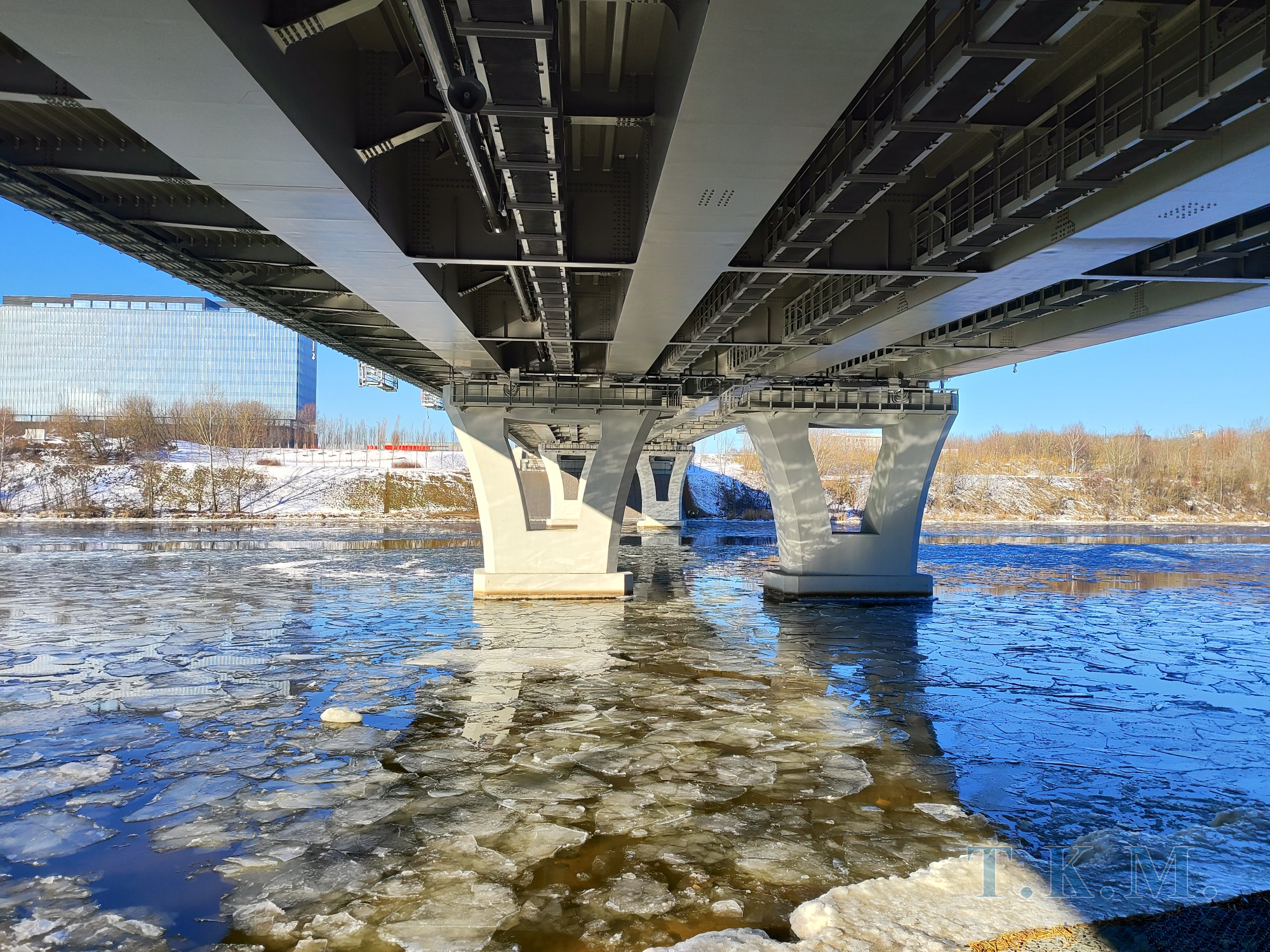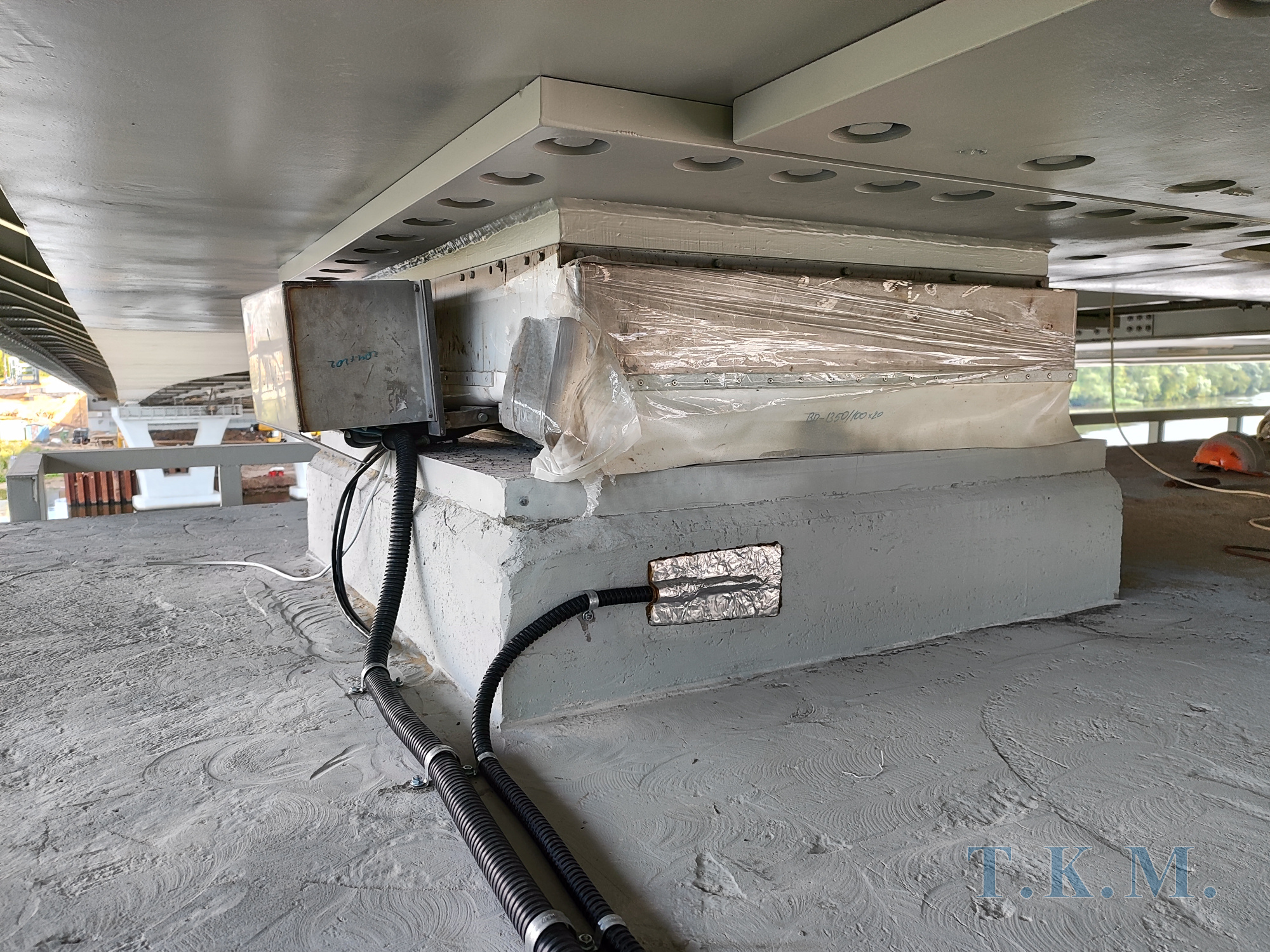 Особенностью моста являются установленные на промежуточных опорах под крайними балками опорные части марки ЦП-ШСОЧ (цифровая параметрическая шаровая сегментная опорная часть). В ЦП-ШСОЧ имеются первичные преобразователи (датчики), обеспечивающие преобразование измеряемых величин в сигналы. Также имеется контроллер, размещаемый в непосредственной близости от первичных преобразователей.